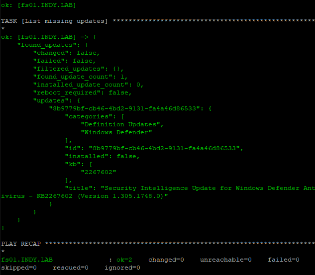 Once you run the playbook you should see the following output indicating if the group has updates or not needed for install. With this information you can create more playbooks to either install specific KB’s or install all pending windows updates.