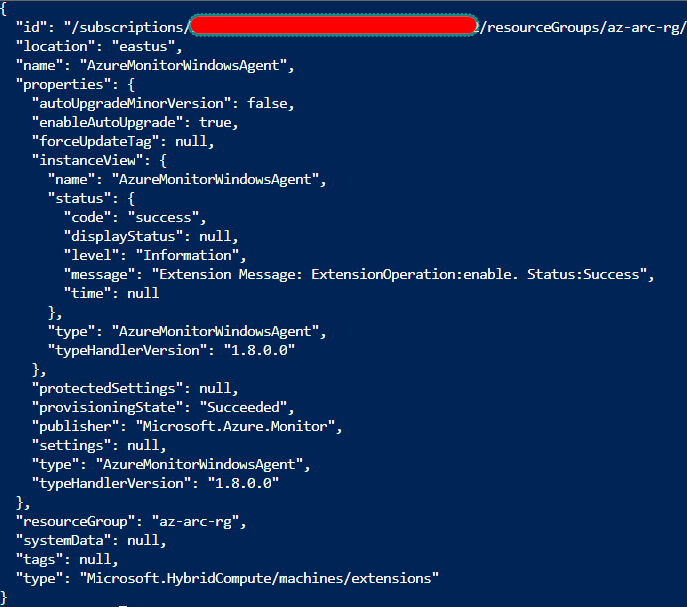 az connectedmachine extension create –name AzureMonitorWindowsAgent –publisher Microsoft.Azure.Monitor –type AzureMonitorWindowsAgent –machine-name –resource-group –location –enable-auto-upgrade true