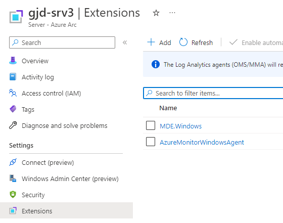 Click on the server you just enabled the AMA agent and then extensions within the blade. You can see the AMA was successfully installed.