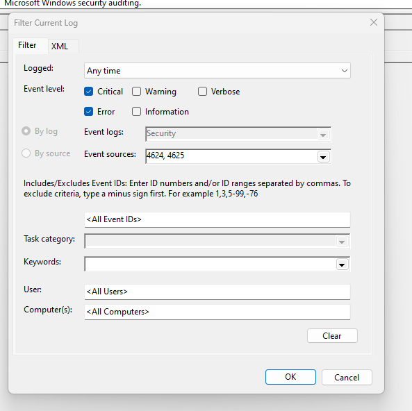 Now we need to fill out the filter. In this example we are going to collect 4624,4625 and only levels of Critical and Error.