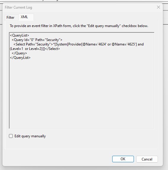 “Security”>*[System[Provider[@Name=’4624′ or @Name=’4625′] and (Level=1 or Level=2)]]