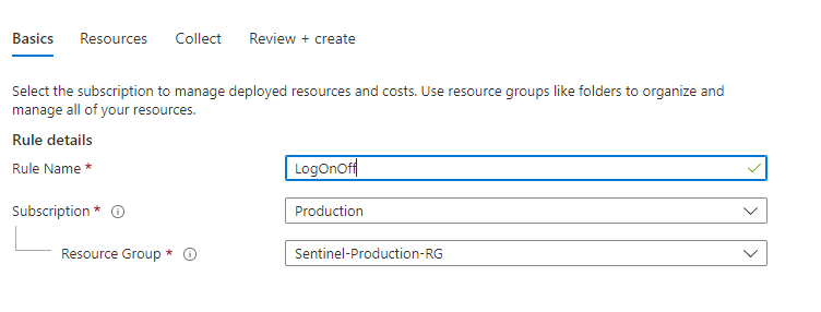 Now that you have your XPATH Open up the data connector for Windows Security Events via AMA. Click on the Create Data Collection Rule and fill out the Basics