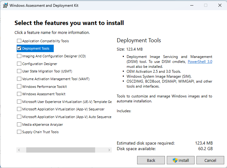 Install both ADK for Current version and win PE ADK also. For this exercise you only need the Deployment Tools