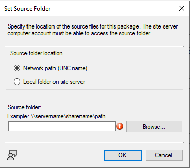 Next Click on the box that says “This package contains source files and click browse. The following dialog box will come up and click on Browse again. Make sure the Network UNC name is checked also.