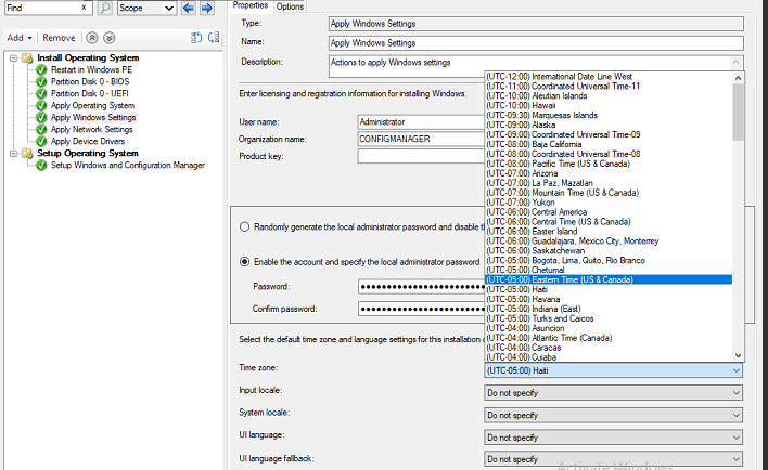 Next click on the Apply Windows settings. Again you can set it to create a new password for the admin account and disable the account or create the password and enable the account. Do what ever works best for your environment. I would also suggest to set the Time Zone.