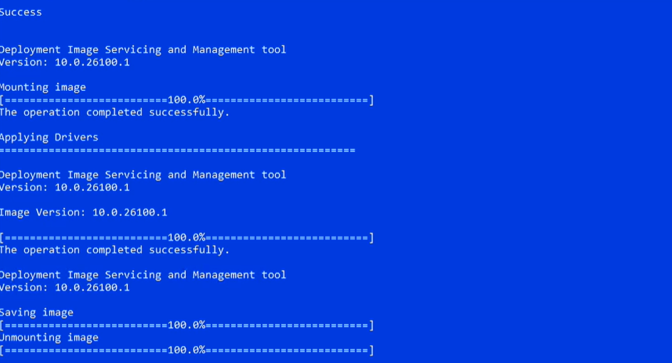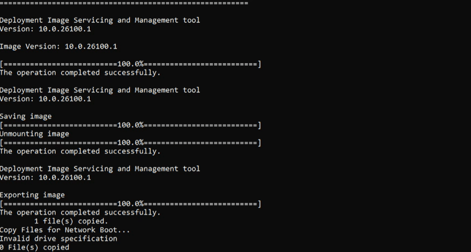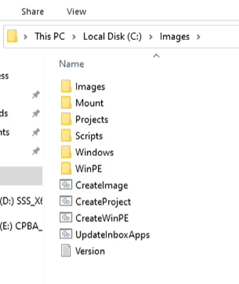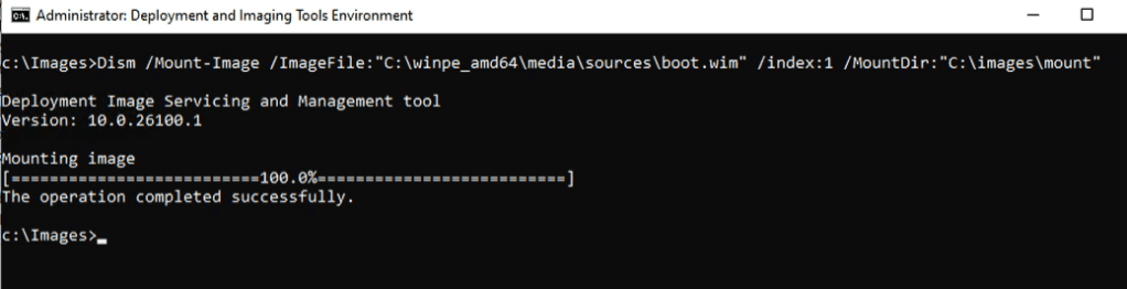 Dism /Mount-Image /ImageFile:”C:\winpe_amd64\media\sources\boot.wim” /index:1 /MountDir:”C:\images\mount”