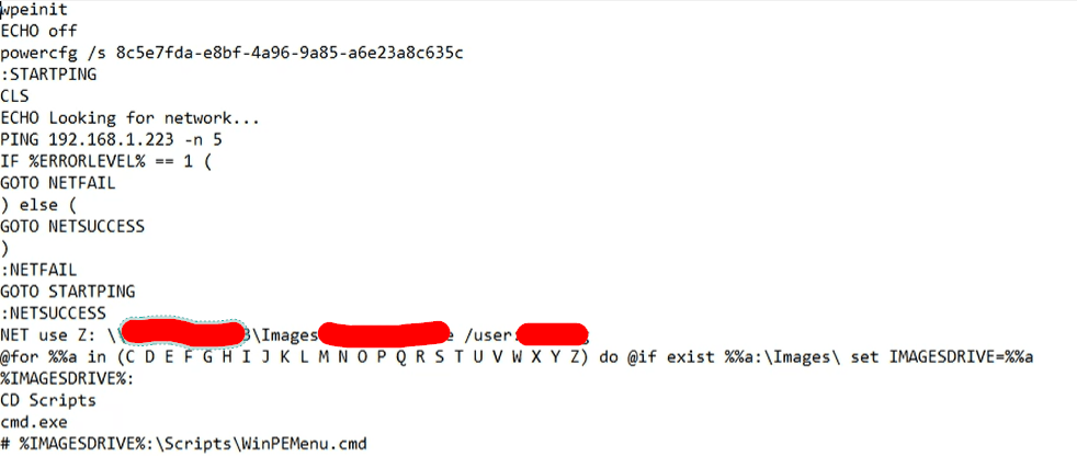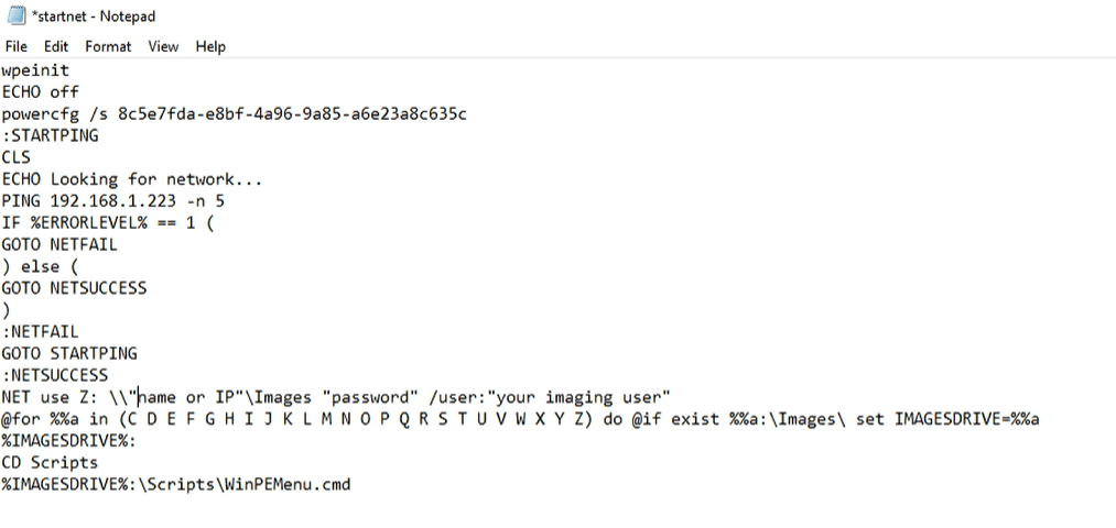 Now you have mounted that WIM file. Now lets browse to the Windows\System32 directory and open the file startnet.cmd As you can see this is the text that you filled in with your IP or name of the server and username and password. What happens is once you import this boot.wim into WDS, its first task is to run this file which then maps the image folder on the server and last command is to run the WinPEMenu.cmd.