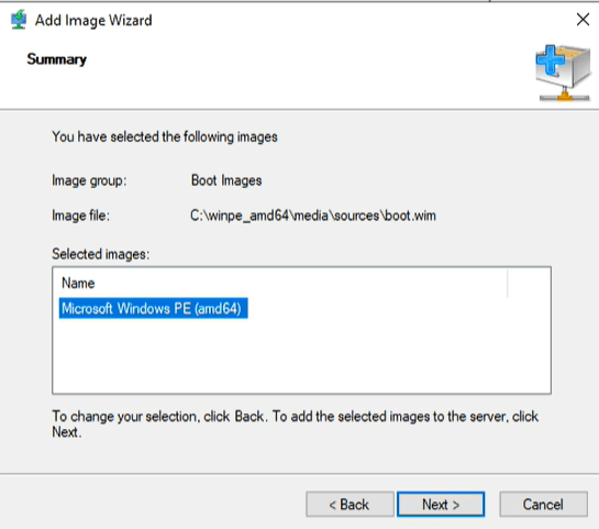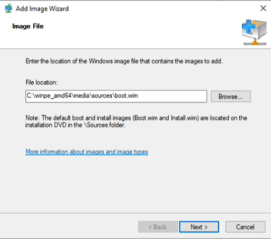 Browse to the WIM we created, its location is c:\winpe_amd64\media\sources\boot.wim and click next