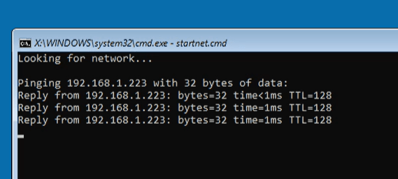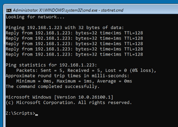 There you go, you are all booted up, on the network and ready to run some DISM commands. if you would type a DIR command you will notice you see all the scripts and folders of the image directory