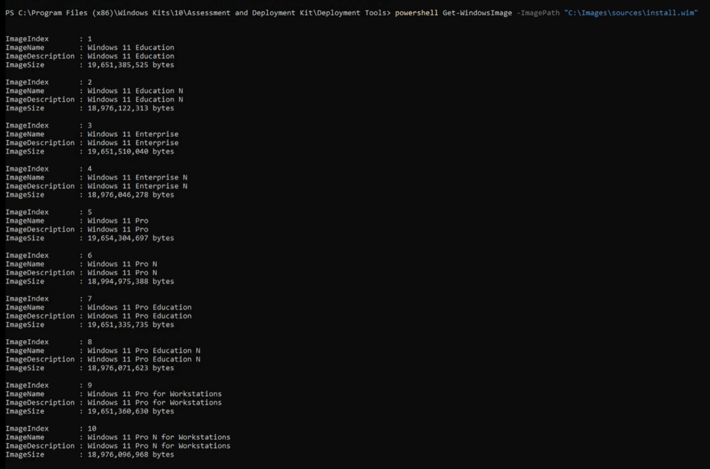 powershell Get-WindowsImage -ImagePath “C:\Images\sources\install.wim”