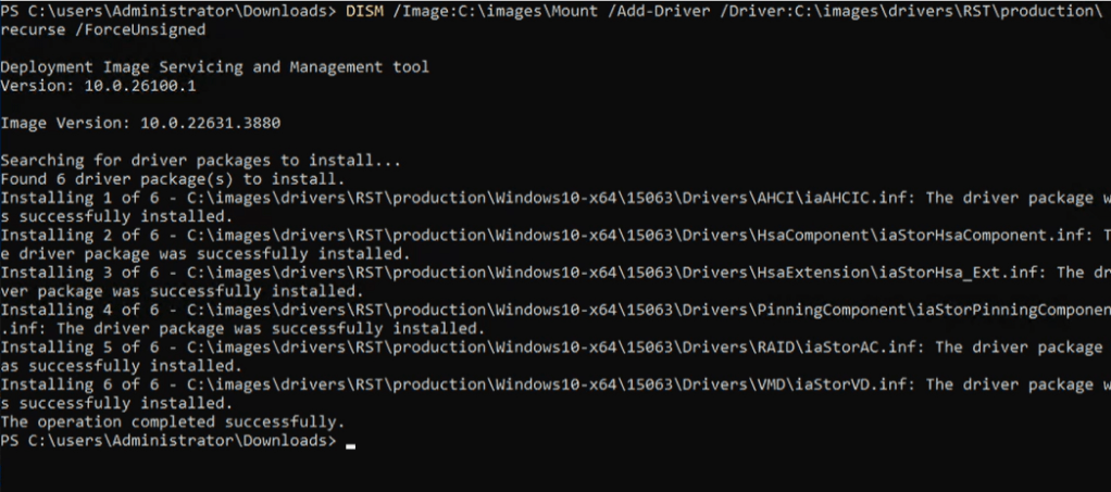DISM /Image:C:\images\Mount /Add-Driver /Driver:C:\images\drivers\RST\production\ /recurse /ForceUnsigned