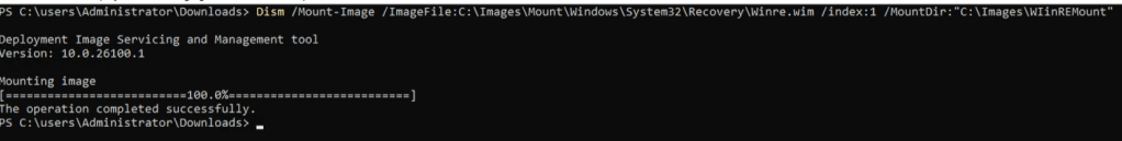 Dism /Mount-Image /ImageFile:c:\images\mount\Windows\System32\Recovery\Winre.wim /index:1 /MountDir:”C:\images\WinREMount”