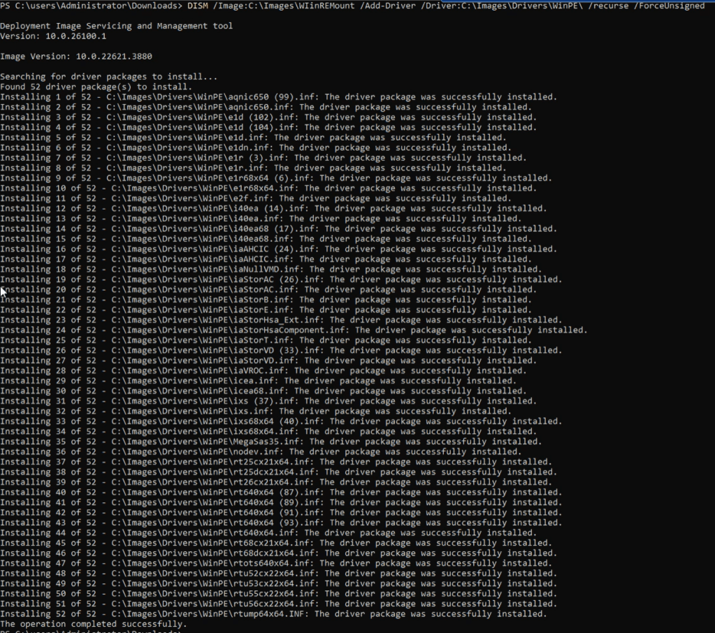 DISM /Image:C:\images\WinREMount /Add-Driver /Driver:C:\images\drivers\WinPE\ /recurse /ForceUnsigned