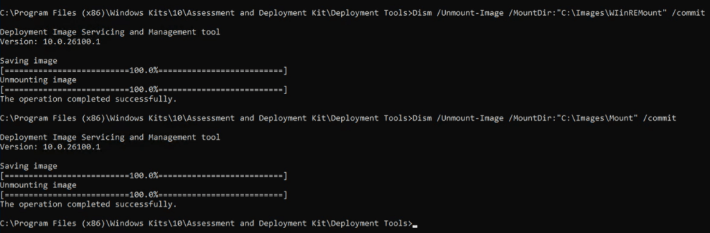 Dism /Unmount-Image /MountDir:”C:\images\WinREMount” /commit