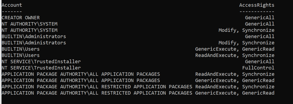 get-ntfsaccess -path c:\windows | select-object -property account, accessrights