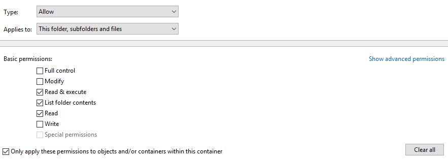 One other side note I would like to point out. When setting permissions, and this one really made me feel like I have only been doing this for 29 minutes instead of 29 years, was manually setting NTFS Permissions. When you go into advanced and pick the account you want to have permissions, notice the check box at the bottom of the picture.