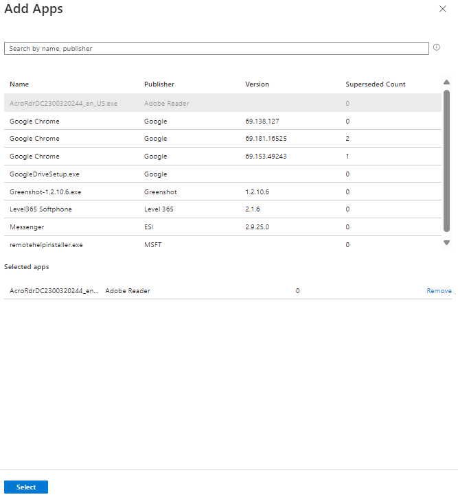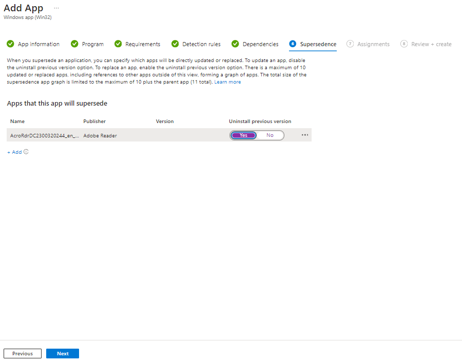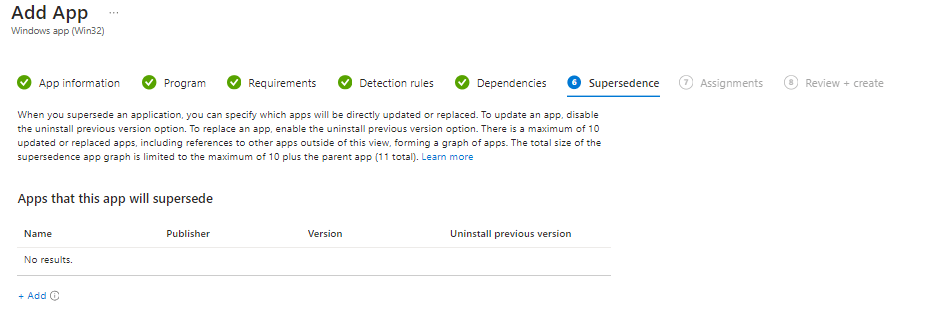 Supersedence, this is a great feature which will allow you to uninstall the previous version. If you want to do this click add. Remember when I said you would thank me later for putting in the version number?